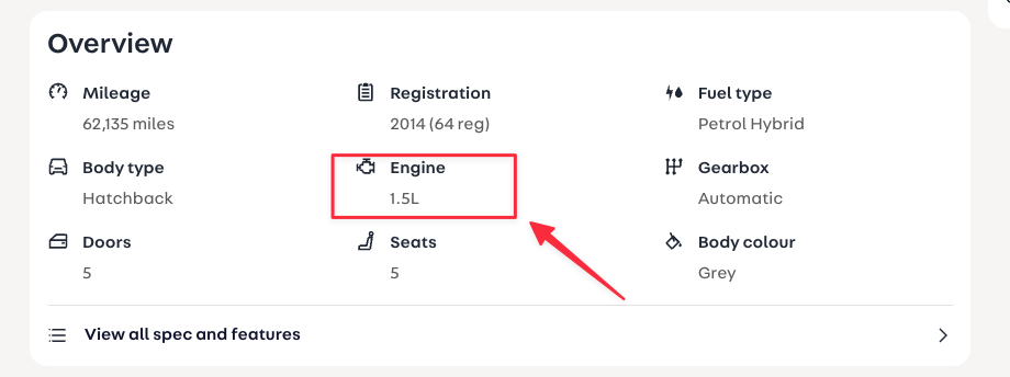 If you’re looking at cars on a website like Autotrader, you’ll see an engine size mentioned like this: